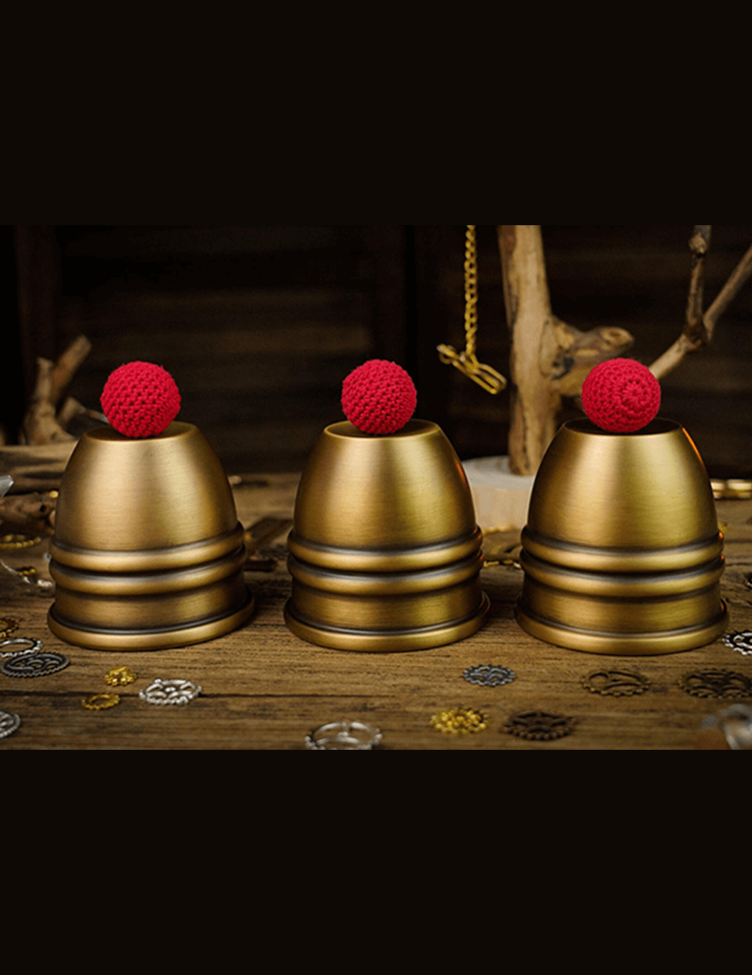 We are proud to present our final version of the brass cups: The Artistic COMBO Cups and Balls Set. This chop cup version features new machining technology to conceal the gimmick and ensure that the three cups are identical. We have made several improvements to the details.