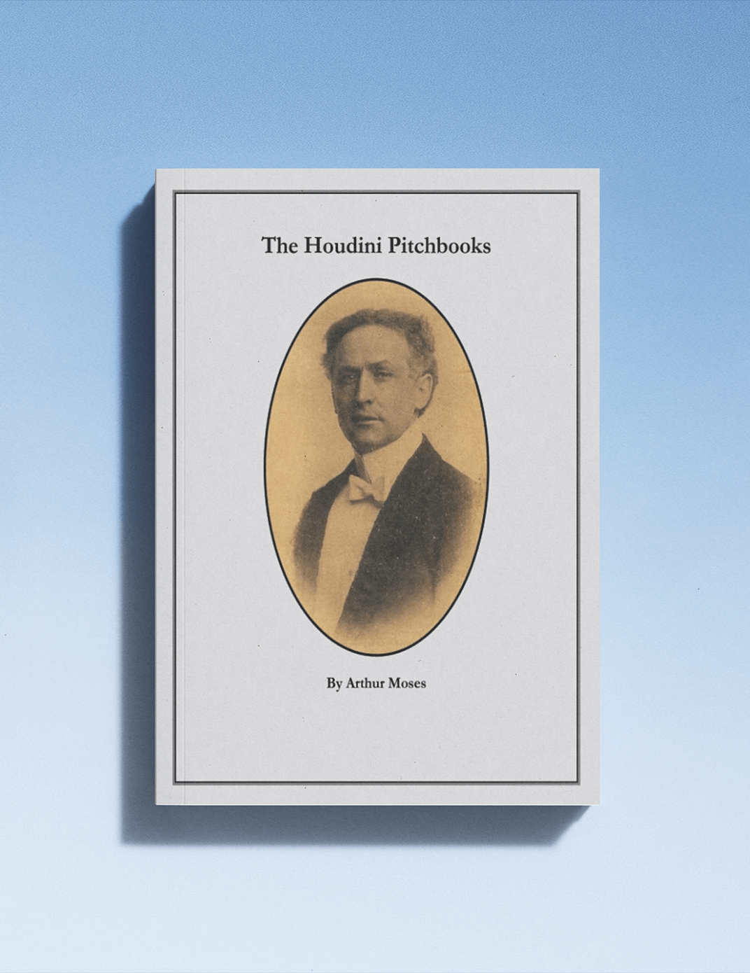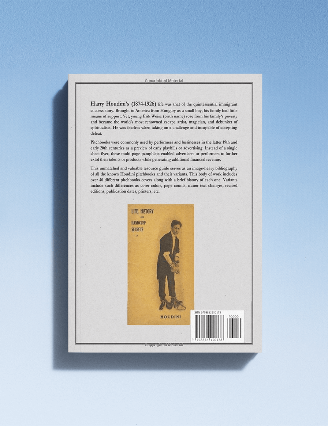 Includes all the known Houdini pitchbooks and their variants. This body of work includes over 40 different rare pitchbooks, including their cover images, along with the history of each. Variants include such differences as cover colors, page counts, minor text changes, revised editions, publication dates, printers, etc.