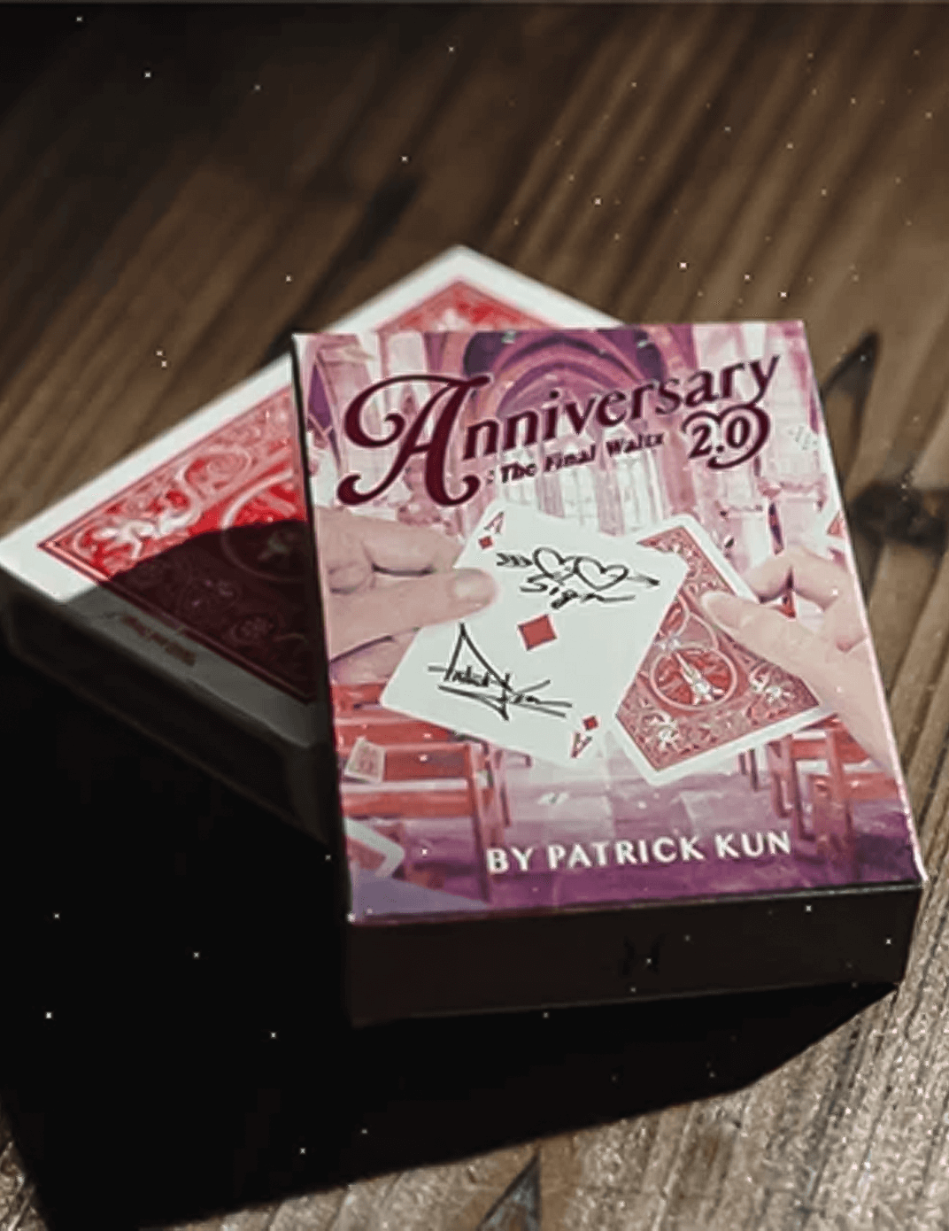 Playing cards with 'Anniversary 2.0' and 'By Patrick Kun' text on a wooden surface.