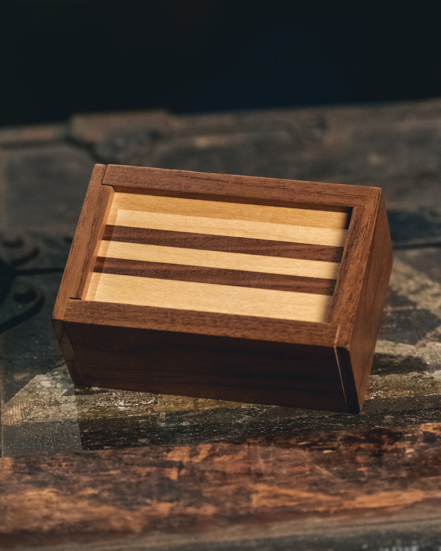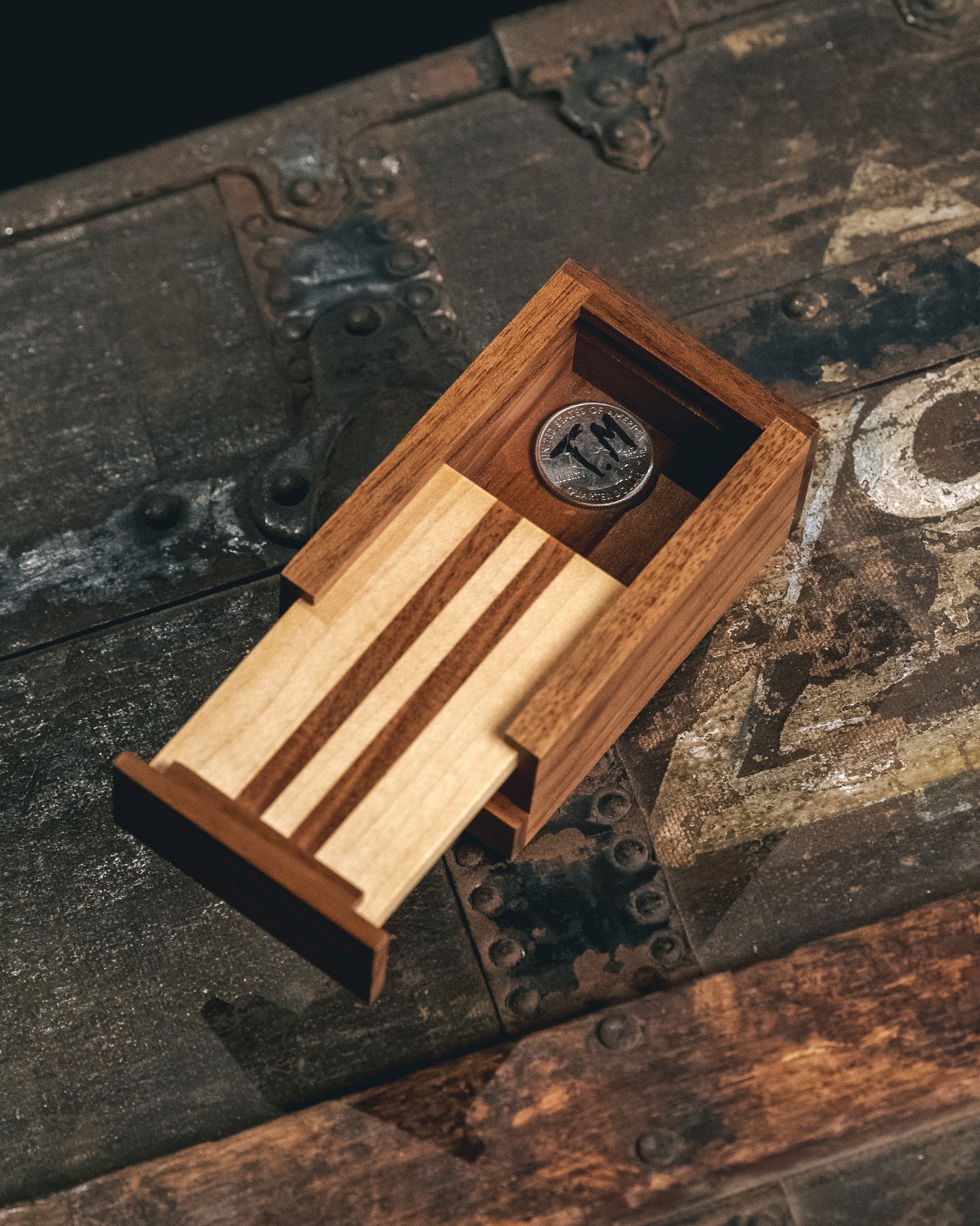 A borrowed ring or signed coin is cleanly dropped into a wooden box. The spectator can hold it and shake it - they can feel and hear that the object is still inside. But on your command, the object will disappear. They try to shake it again, but the box is now silent and they don't feel anything jingling inside. When they open the box, they find that their object has completely vanished.